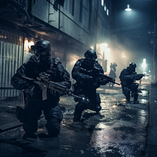 four man swat team exterior cultural lighting night industrial buildings cinematic wet ground