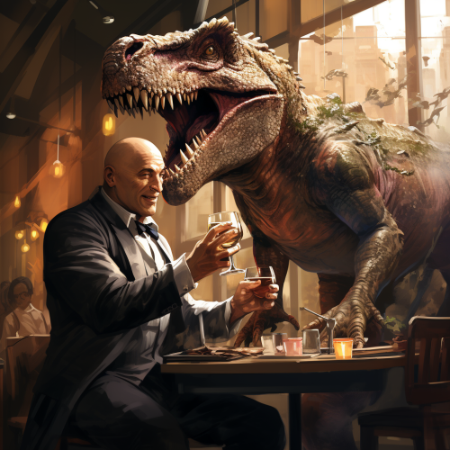 a bald head man is drinking champagne while he stroking the head of a tyrannosaurus rex dinosaur --style raw --s 250