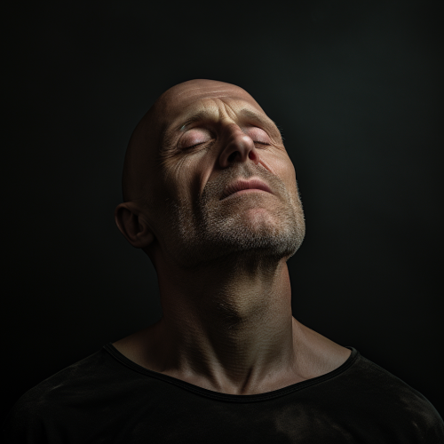 a man that is breathing out and it is his last breath and you can see all of his thoughts and dreams coming out in his last breath. He is bald. About fifty years old. He is white