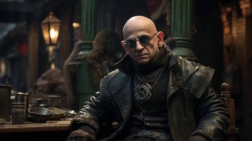 photorealistic movie still of bono as a bald elf with steampunk goggles stumbling around drunk in front of a battered victorian warehouse, leather armor and a cloak, victorian architecture, ruined medieval city, UHD 4K, ultrarealism, dynamic lighting, photorealism --ar 16:9 --v 5.2