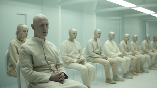 photorealistic movie still of a room of bald catatonic patients sitting in a daze in a white room with intense clinical lighting, UHD 4K, ultrarealism, hyperrealism, cinematic lighting, photorealism --ar 16:9 --v 5.2