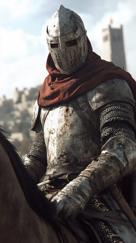 Baldwin IV rides horse through desert, arm limp symbolizing illness.