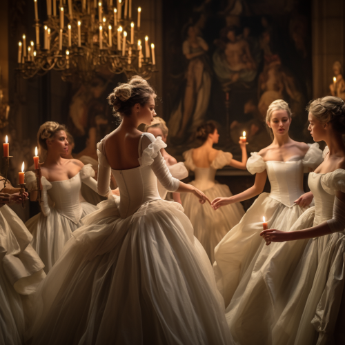 ralph lauren lifestye looking photograph of ballerinas wearing fancy all white ballerina balldresses in a decadent 14th century french castle lit by chandeliers and candles