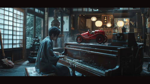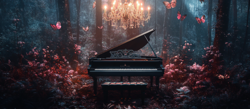 a piano on ground and centre beautiful romantic background forest night scene some flowers and chandelier beautiful light in background some butterfly flying dark red purple theme cinematic --ar 16:7 --v 6.1