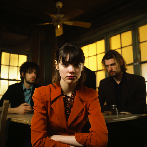 photos of a new alternative alt indie band from 2023 called "About Velvet" for their website at an empty kitchen table, warm lighting, 2000s style composition.