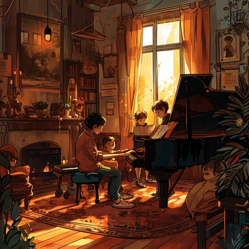 a cozy piano studio, one kid playing the piano and three friends are around him, comic style --v 6.0
