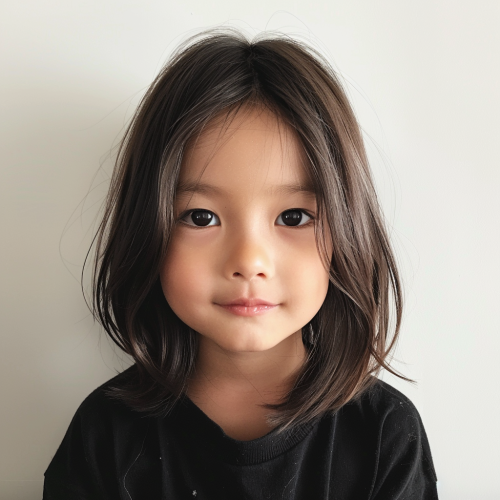 A 6-year-old cute Korean girl with dark brown straight hair. Proof photo
