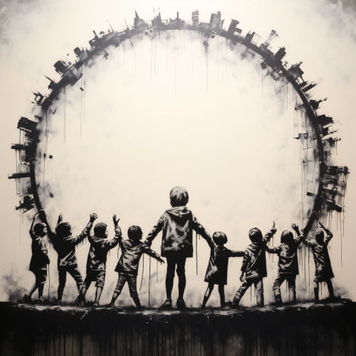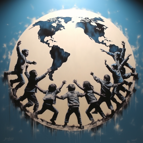 imagine a bansky stencil spray paint of 4 children doing a round dance around the earth, child are as big as the earth