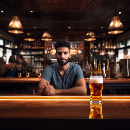 8k ultra realistic wide angle photo of bar top in a college bar, with beers on bar top, in the background a very handsome young man works behind bar, college bar style background , award winning photography ,cinematic, --style raw --v 5.2