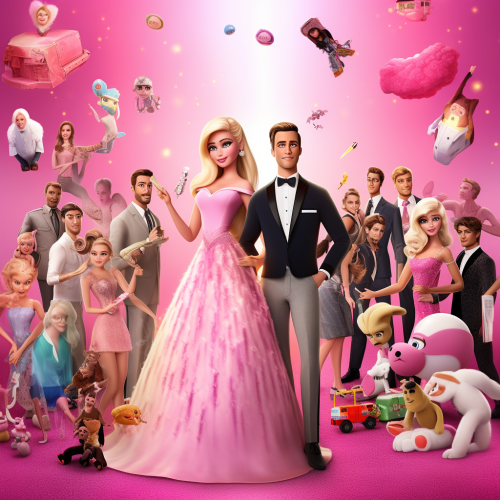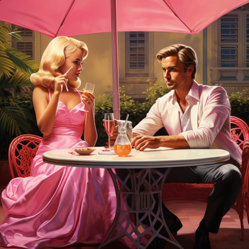 high quality, vivid detail of barbie as played by Margot Robie, in a wide pink dress sitting at a table with ken played by Ryan Gosling, sipping drinks and relaxing outside her pink mansion, under a table with an umbrella, and bright sunlight