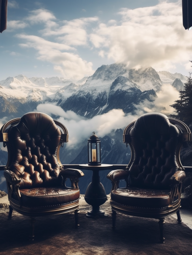 chairs with the view of the mountains and mountains behind them, in the style of futurist claims, studyblr, luxurious, frostpunk, windows vista, maori art, captures the essence of nature --ar 3:4