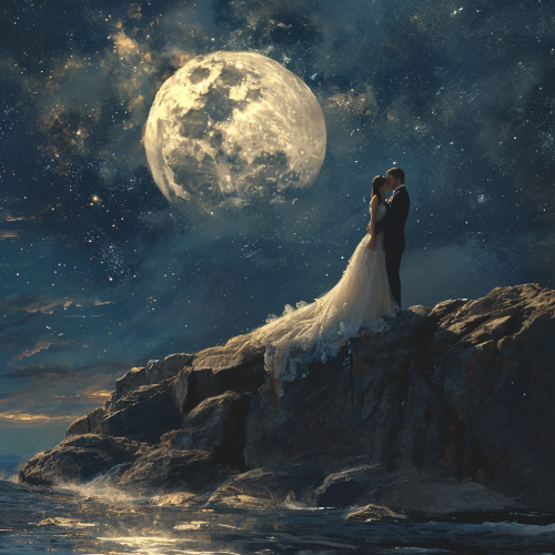 An incredibly realistic and detailed image of a clear starry night on a beautiful rock of a couple, the woman in a long white wedding dress and the man in a suit embracing each other with a big and beautiful moon in the sky. create. This work of art should exude a sense of mystery and peace and depict the peace that comes with the beginning of their lives. --v 6.0
