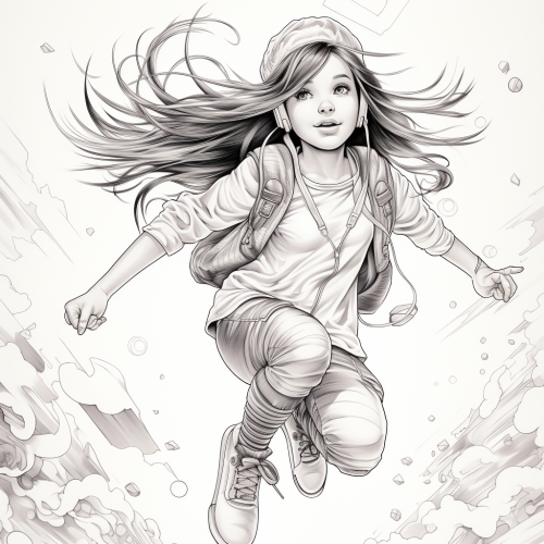 A Coloring page for kids 1980's American style line work drawing no shading 10 year old girl with long hair and bangs he is wearing over-alls and mary jane sneakers the girl is flying like super woman no equipment