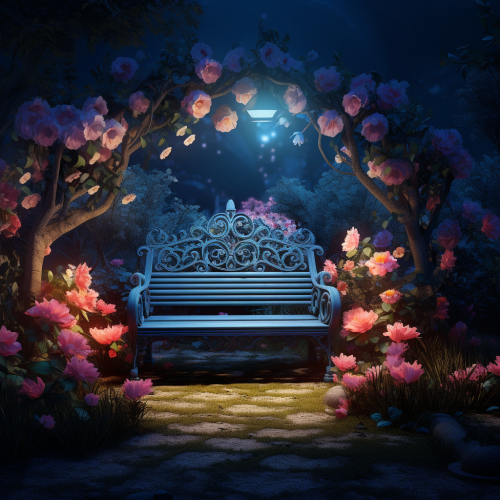 baroque french style garden, bench, full of colorful flowers,night, photorealistic, cinematic, --v 5.2