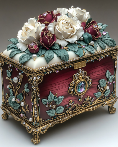 Create a cake that has a magical music box and jewelry box design theme from Versailles. Use wood tones and burgundy red and gold metallic colors. Bright white roses and green leaves. Gold Royal icing filigree and paisley and swirl designs. Rhinestones and gems and iridescent pearls. --ar 4:5 --v 6.1 --stylize 500