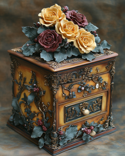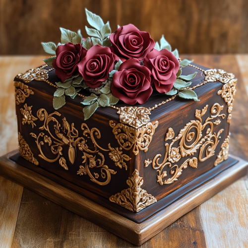 Create a cake that has a magical music box and jewelry box design theme from Versailles. Use wood tones and burgundy red and gold metallic colors. Red roses and leaves. Gold Royal icing filigree and paisley and swirl designs.