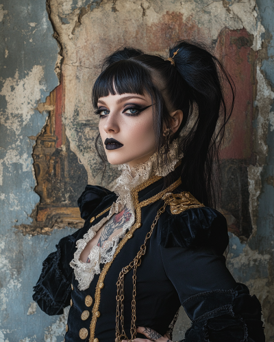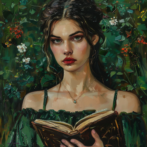 A 22 year old baroque styled woman reading a book while walking through a pompous garden. She has dark brown straight hair, green eyes and dark red lipstick. Baroque styled painting. Hand brushed texture