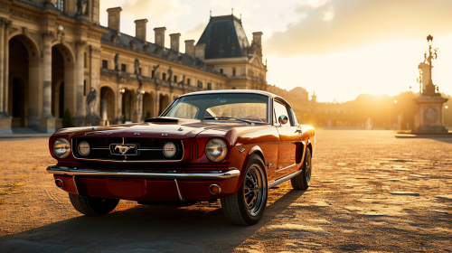 commercial photography of a classic Ford Mustang in front of the Château de Versailles, Frances, sunny, bright --v 6.0 --ar 16:9 --s 250