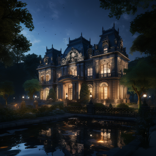 black mansion based on Clermont-Ferrand Cathedral and the Palace of Versailles, nighttime