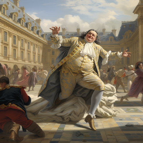 Create hyper realistic spooky ghostly Marie Antoinette and the King of 18th century France in front of Versailles. Both next to a guillotine during Halloween night. Spooky set design. Full moon. Fall leaves and spiders and bats. --ar 4:5 --v 6.1 --stylize 500