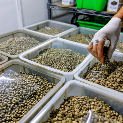 an indoor cultivation room office with several varieties of cannabis seeds, in 4k high resolution, with a young hand sorting them