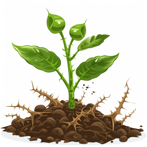 a healthy sprout plant growing out of good soil, other plans, thorns bushes around the healthy plant --style raw