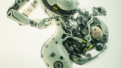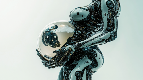 Very beautiful pregnant android woman with strange distorted forms, profile view. A beautiful female profile is seen. Transparent abdomen with mechanistic embryo is visible. Very intricately arranged beautiful mechanical legs. Very high detail of parts and mechanisms. Photorealistic image. Salvatore Dali style --ar 16:9
