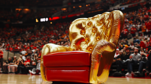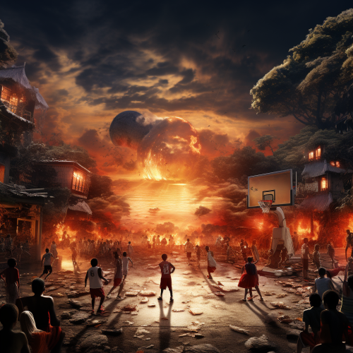 An awe-inspiring basketball court illuminated by the fiery wings of a rising phoenix, set within glowing embers that symbolize rebirth, resilience, and confidence. The court is bathed in warm hues of gold, orange, and red, creating an uplifting and powerful atmosphere. The center of the court has a subtle glow, with the edges fading into the fiery aura, leaving space at the top for text. The hoop and backboard are etched with intricate phoenix feathers, reinforcing the theme of transformation and strength --ar 2:3 --s 250 --v 6.1