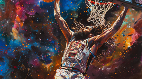 an expressive oil painting of a long curly-haired basketball player with a beard dunking a basketball in a basketball goal, galactic nebula background, splashes of colorful accents, subject in center of frame, hyperrealistic --ar 16:9 --v 6.0
