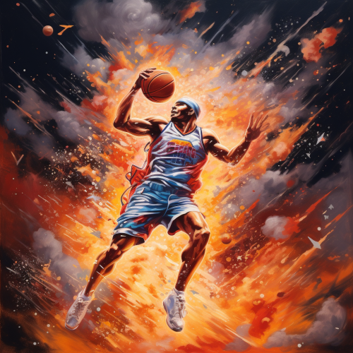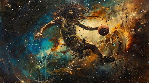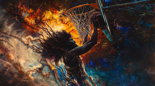 An expressive oil painting of a basketball player dunking, depicted as an explosion of a nebula.