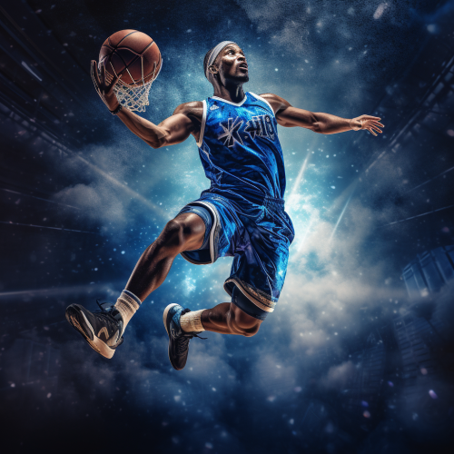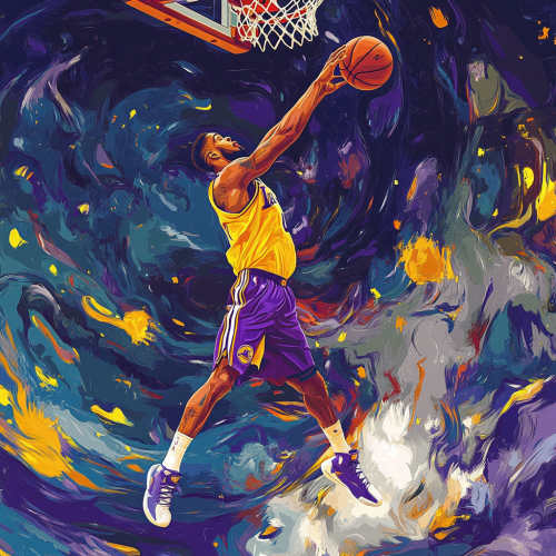 A basketball player mid-dunk wearing classic streetwear, surrounded by abstract shapes and splashes of color. Background has starry night swirls in deep purples and yellows, adding a dreamlike vibe. Urban Pop Art meets Neo-Expressionism, bold and vibrant.