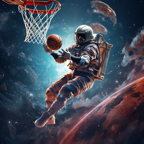 a basketball player dunking while wearing an astronaut helmet in a soccer field