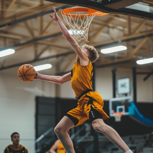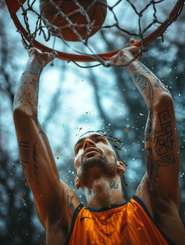 portrait basketball player slam dunking a basketball, playing basketball nba court --ar 3:4 --s 300 --style raw