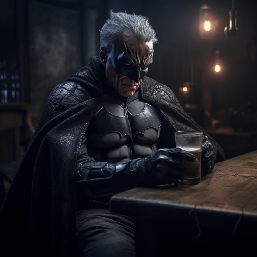 old batman with a walking aid, sitting in a bar and drinking a gin tonic, resembling Christian Bale, tritone, dark colors, moody, sad face
