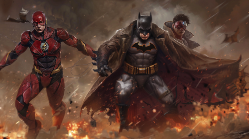 Background is the knightmare scene from Zack Snyder’s justice league. Batman and flash are injured and trying to escape. Flash is dragging Cyborg’s top half. Batman is wearing the trench coat and outfit from the knightmare scene --ar 16:9
