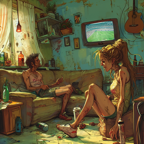 apartment, a woman does all the household chores at the same time, and a man sits on the sofa and watches football on TV, in the style of Joe Madureira, playful cartoons --v 6.0