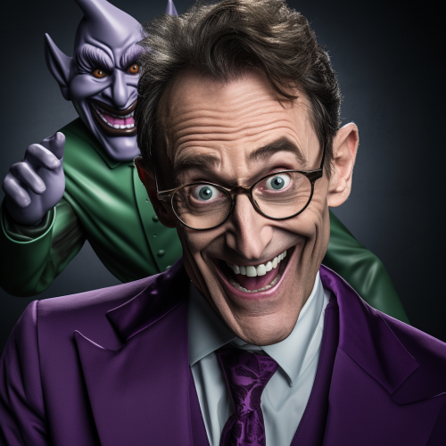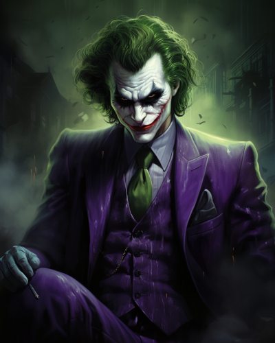wide angle full body view of Jack Nicholson’s The Joker, Jack Napier, from 1989 Batman, dynamic pose, photorealistic, hyperrealistic, depth of field, photography, Cinematic, iso 1200, --v 6.0 --s 750