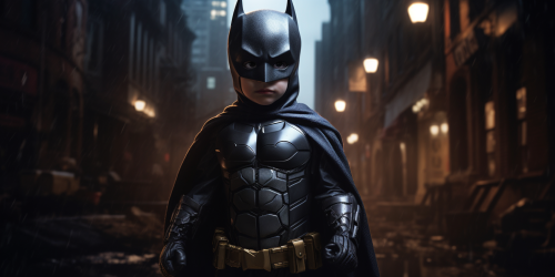 little boy dressed as batman, night and atmospheric, cinematic, anamorphic --ar 2:1