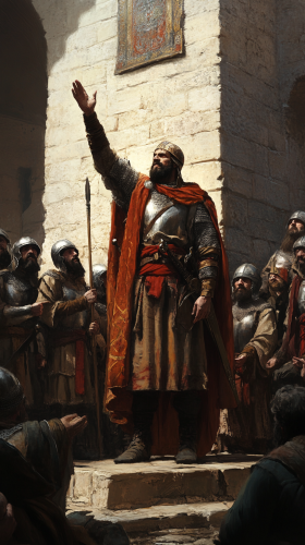 Saladin, standing tall before a group of kneeling citizens, raises his hand in a gesture of mercy. The people look up with gratitude as Saladin’s soldiers stand respectfully behind him, a scene of unexpected peace after battle. Surreal, hyper-realistic, Ultra HD --ar 9:16