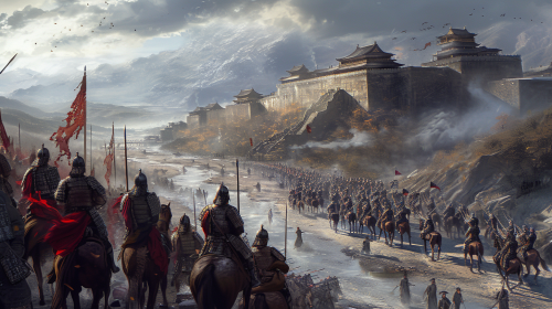 Battle scene with soldiers, archers, and siege engines.