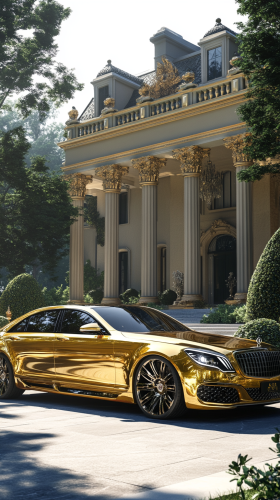 hyper-realistic image of a luxury sedan with a sleek and elegant design, positioned prominently in the foreground, captured with the world's top camera quality, showcasing intricate details such as reflections on the car's polished surface. In the background, a private jet is parked on an airstrip during a dramatic sunset, with warm, golden light highlighting the opulence of the scene. The soft glow of the sunset creates an atmosphere of exclusivity and sophistication, with every element--from the car’s contours to the jet's metallic sheen--rendered in stunning, high-definition clarity --ar 16:9 --style raw --stylize 250 --v 6.1