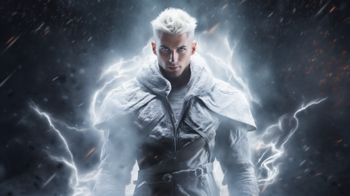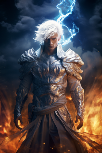 20 year old greek warrior in robes with a glowing fractal in form of a hourglas on a futuristic battlefield. no beard. white hair. full body shot. background scifi battlefield with lightning and forceshields --ar 2:3