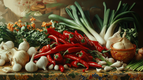 filled with long Korean red peppers, green leeks, onions, and cloves of garlic scattered everywhere on the table, still life, good light, bright color --ar 16:9