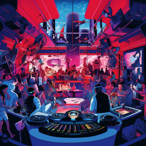 high end bottle service club, full club with dj, cartoon, vibrant colors