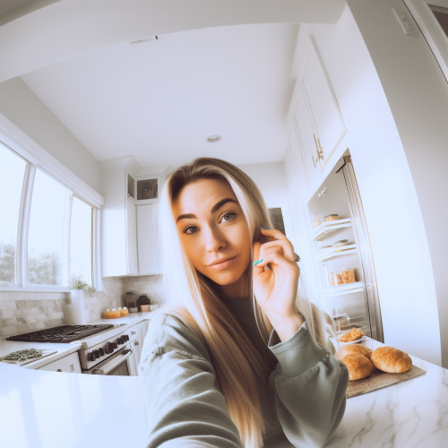 "Bright white IKEA kitchen, lifestyle influencer mom meal prepping kids food, high-key lighting, clean minimalist aesthetic, food ingredients visible on countertop, kitchen appliances in background, natural daylight from window, Instagram-style composition, pov of an selfie, she looks frontal in the camera --v 5.0