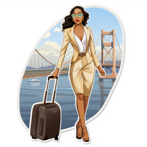 A diecut sticker modern, classy African American woman,travel agent business professional, 2024 era, luggage and high heels, vector, white background, long braids, airplane and bridge in background