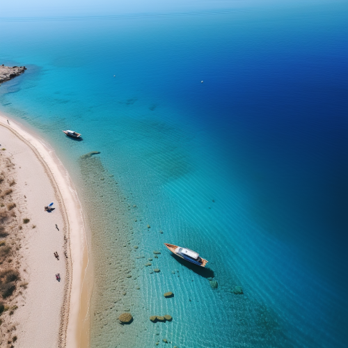 aerial view, seashore, white sand, ruined pier, old boat, seagulls, sunny autumn, clear water, mood of happiness and peace, top down view, cinematic effects, photorealism, wallpaper --s 250 --v 6.1