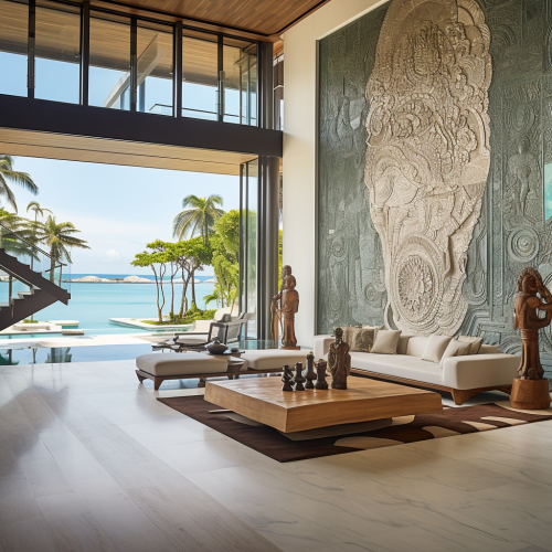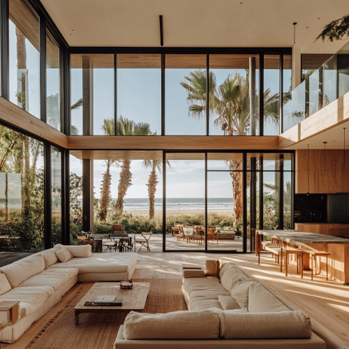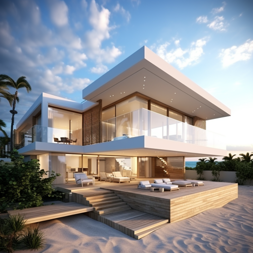 I'm seeking a visually stunning render for a beachfront residence characterized by a sleek, modern design. The property boasts dimensions of 9 meters facing the sea and 19 meters in depth. The architectural vision includes 2 to 3 bedrooms strategically positioned on the upper floor, with special attention to providing the master bedroom with the most captivating view. The focal point of this coastal retreat is an exquisite infinity pool seamlessly integrated into the main floor. This floor houses the kitchen, dining area, and living room, creating a harmonious flow between indoor and outdoor spaces. The goal is to capture the essence of contemporary coastal living, blending elegance with functionality in every detail.