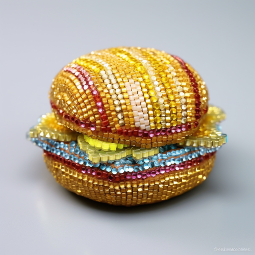 brooch in the shape of a burger made of beads and rhinestones, white background, photorealism, top view --v 5.1