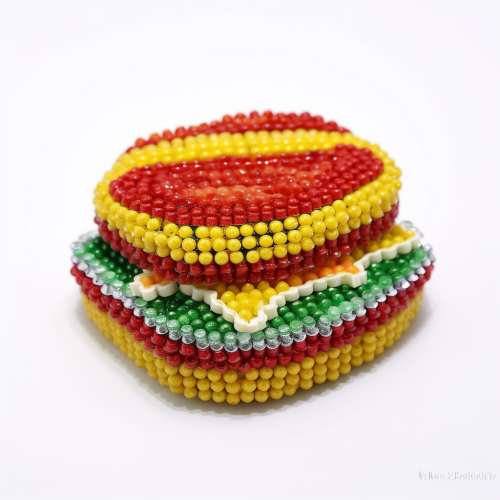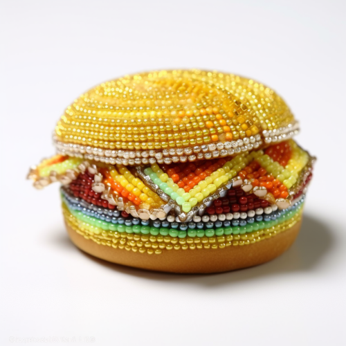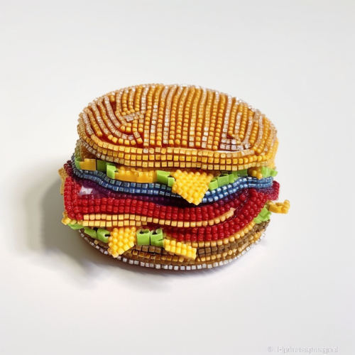 flat brooch in the shape of a burger made of beads and rhinestones, white background, photorealism --v 5.1
